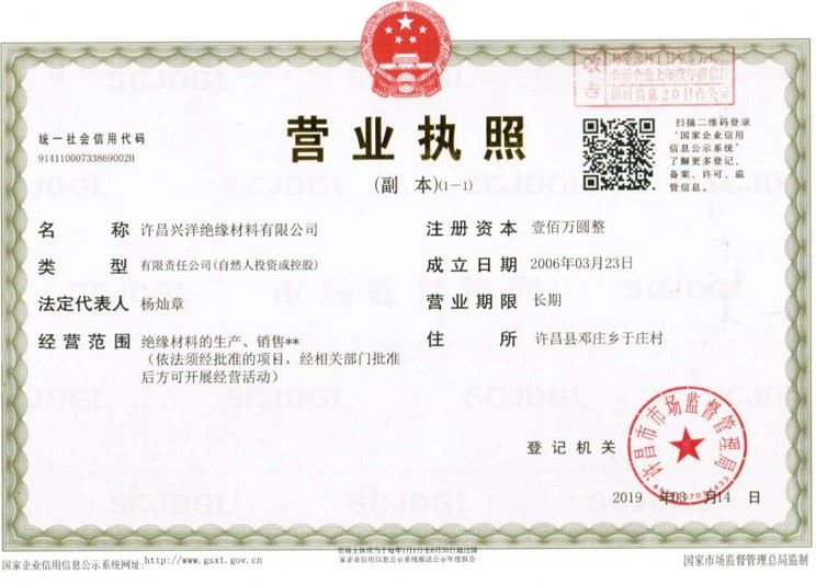 許昌蜜桃视频絕緣材料有限公司營業執照(zhào)